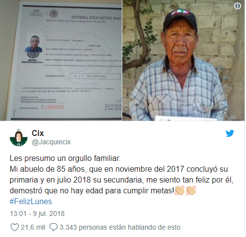 “Me siento feliz por él, demostró que no hay edad para cumplir metas”, escribió la tuitera, identificada con el sobrenombre Cix.