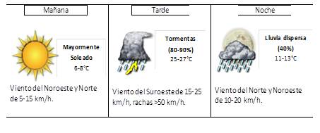 Ambiente frío sería perceptible por la mañana, la temperatura máxima pronosticada podría alcanzar valores de 25-27°C presentándose viento del Suroeste de 15-25 km/h y algunas rachas de hasta 50 km/h en el momento de las tormentas. Por la noche se prevé disminuya la nubosidad pero presentándose potencial de lluvias aisladas dominando ambiente fresco a frío.