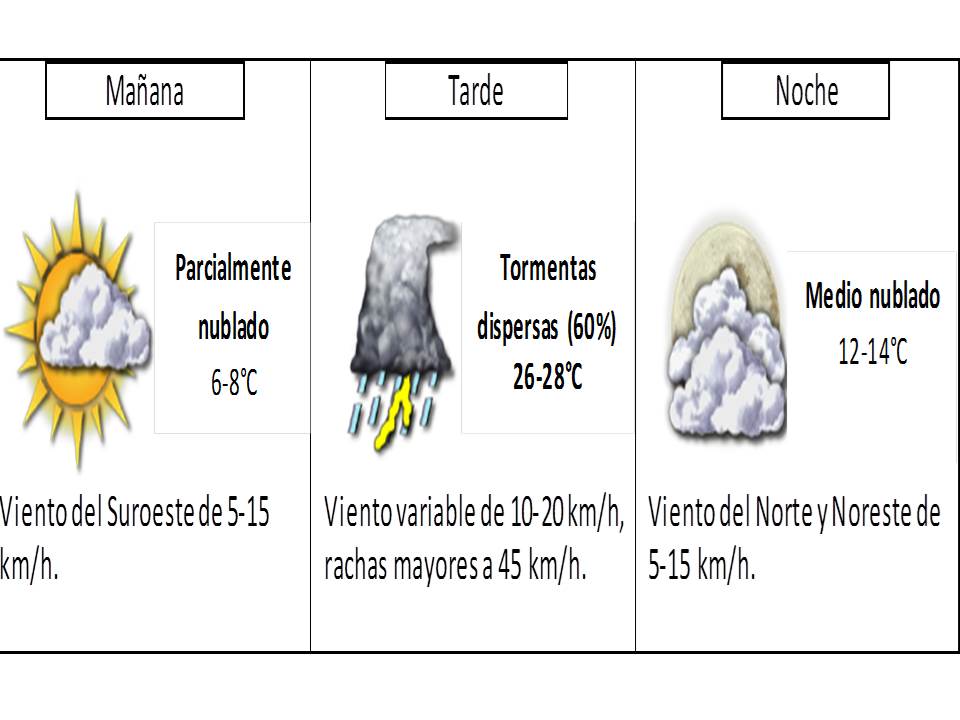 Se prevé una mañana mayormente despejada con ambiente fresco a frío, registrando valor mínimo de 6-8°C, posteriormente la temperatura se elevará hasta los 26-28°C situación que apoyada con la humedad y efectos locales de montaña estarán dando como resultado nuevamente tormentas con granizo y viento arrachado durante la tarde y noche.