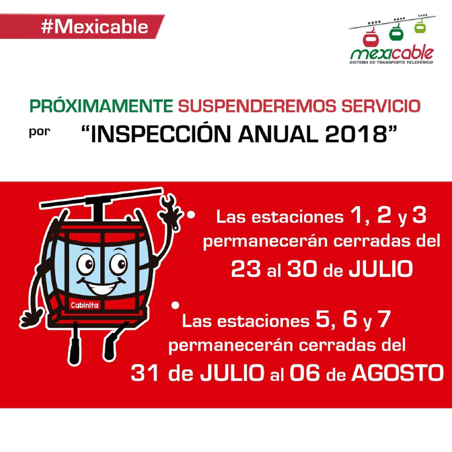 Para conservar la operación óptima del Mexicable, el Sistema de Transporte Masivo y Teleférico del Estado de México (Sitramytem) suspenderá el servicio del 23 al 30 de julio y del 31 de julio al 6 de agosto.