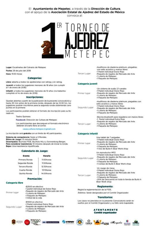 El gobierno municipal que encabeza el presidente David López Cárdenas, con apoyo de la Asociación Estatal de Ajedrez del Estado de México, lanzó la convocatoria correspondiente para participar en el 1er Torneo de Ajedrez Metepec 2018 que tendrá lugar el próximo 29 de julio en las Escalinatas del Calvario, ubicadas en el primer cuadro del Pueblo Mágico.