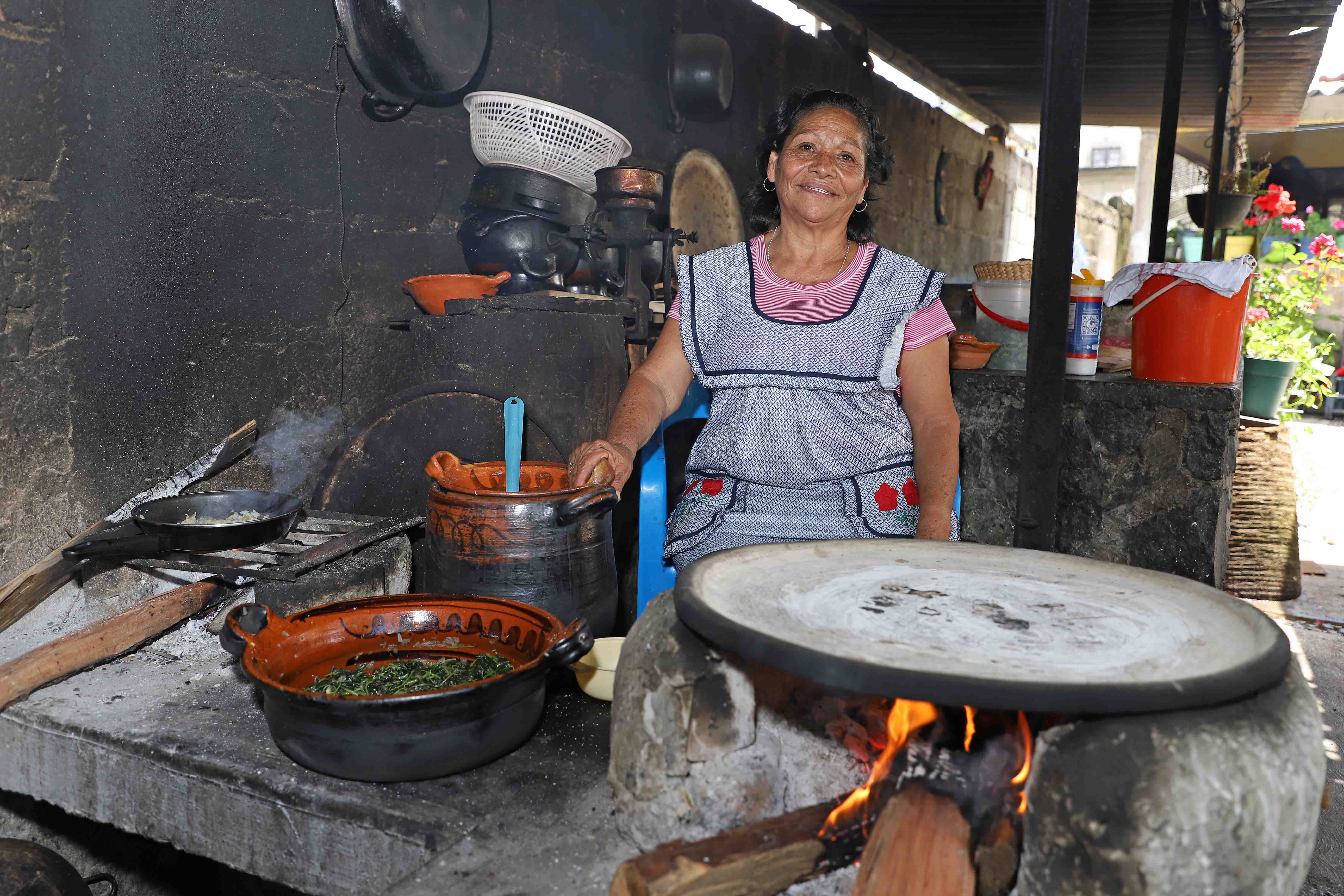 Con especial dedicación Hortensia Flores Arce y Agrícola Martínez Chagre, cocineras tradicionales, ponen el ocote sobre las bases de adobe, en cuya superficie hay extensos comales de barro e inician la colocación de ollas y cazuelas, donde serán cocinados frijoles, tortillas de mano, quintoniles, habas, además de salsa verde en molcajete.