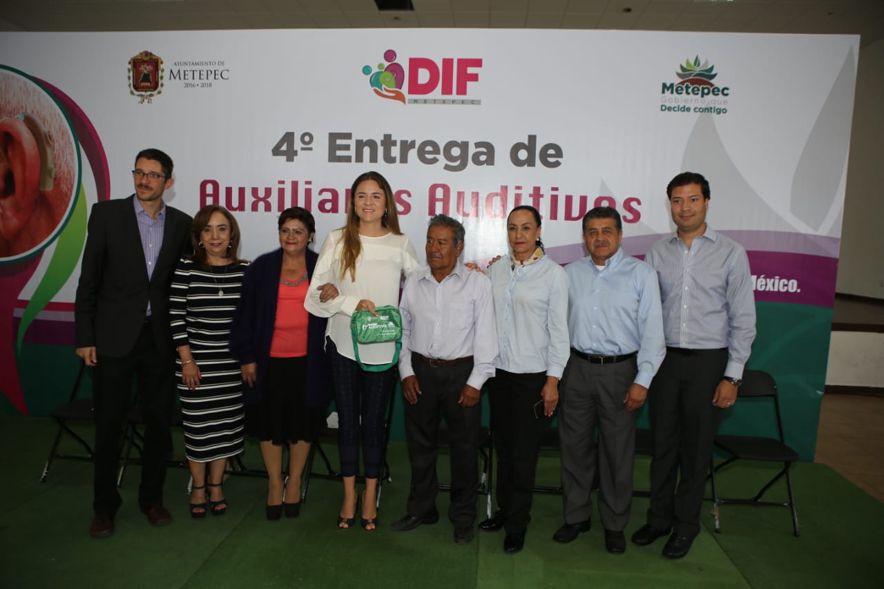 La presidenta del DIF Metepec, Gabriela Bringas Abarca, encabezó la entrega de 50 auxiliares auditivos para vecinos del municipio, en su mayoría personas de la tercera edad, quienes podrán realizar sus actividades cotidianas sin la limitación de escuchar.