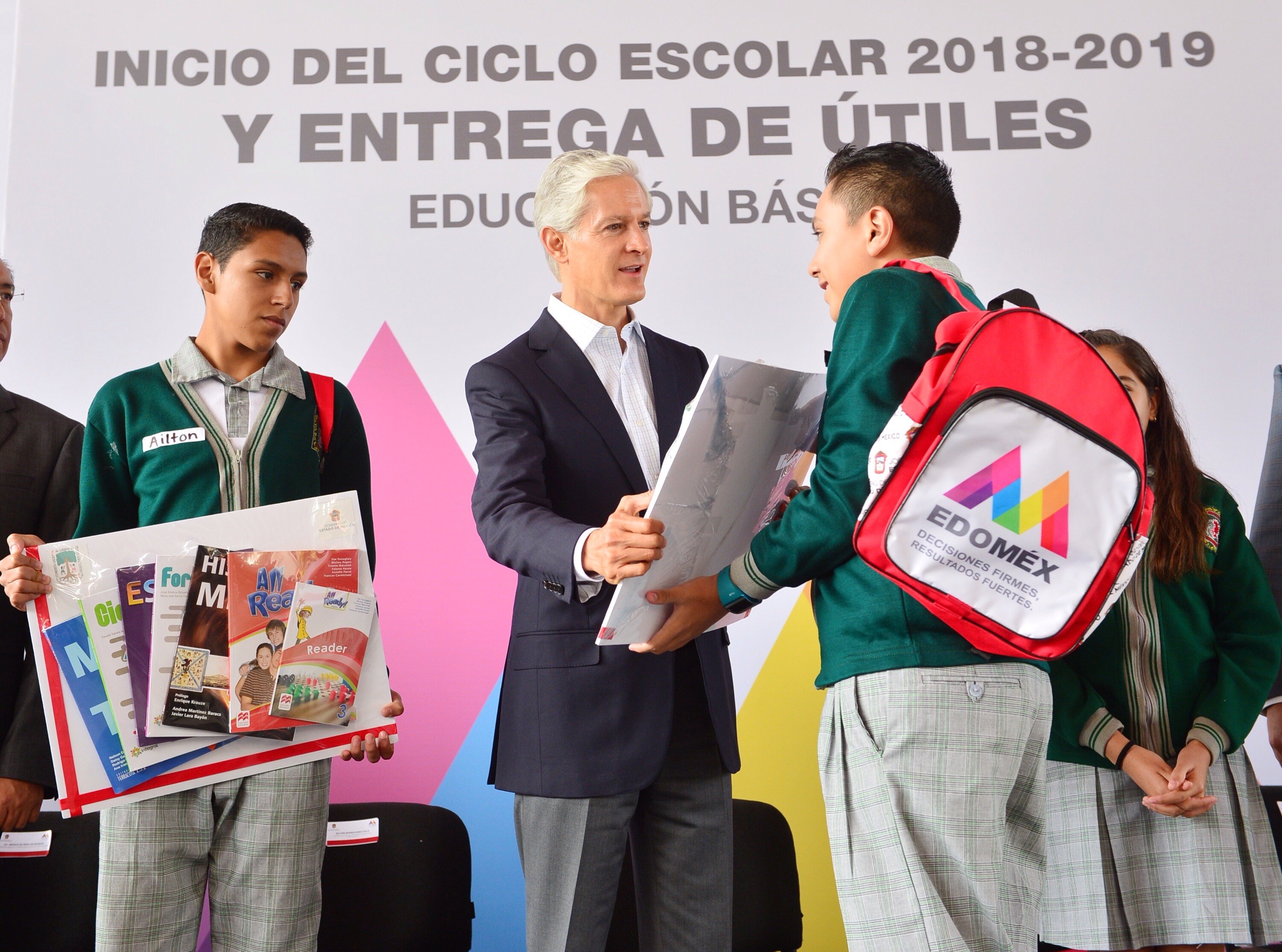 Al inaugurar el Ciclo Escolar 2018-2019, el Gobernador Alfredo Del Mazo Maza dio inicio a la entrega gratuita de más de 3 millones de paquetes de útiles escolares para alumnos de nivel básico, programa que tiene como finalidad apoyar en la economía de los padres de familia, ya que se cubre el 85 por ciento de los materiales que pide la Secretaría de Educación Pública.