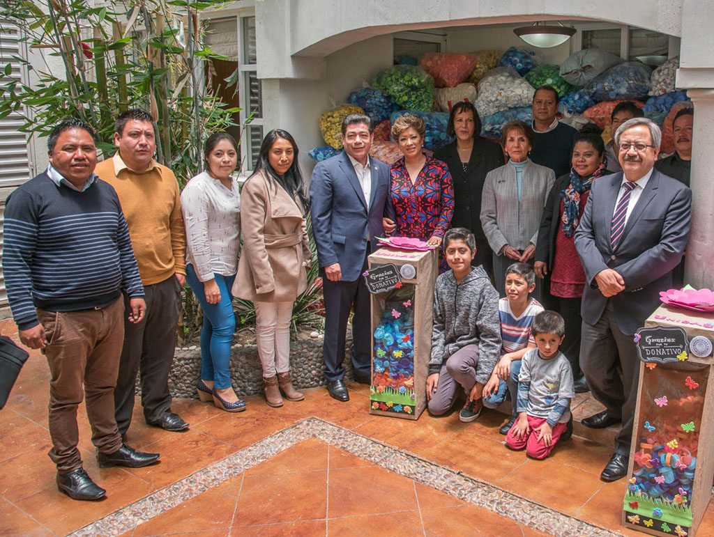 En apoyo a niños con cáncer y sus familias, los diputados Miguel Sámano Peralta y Mario Salcedo González encabezaron la entrega a la Fundación Tapitas, de 150 mil tapas de pet con las cuales esta organización obtendrá recursos para el pago de tratamientos de esa enfermedad.