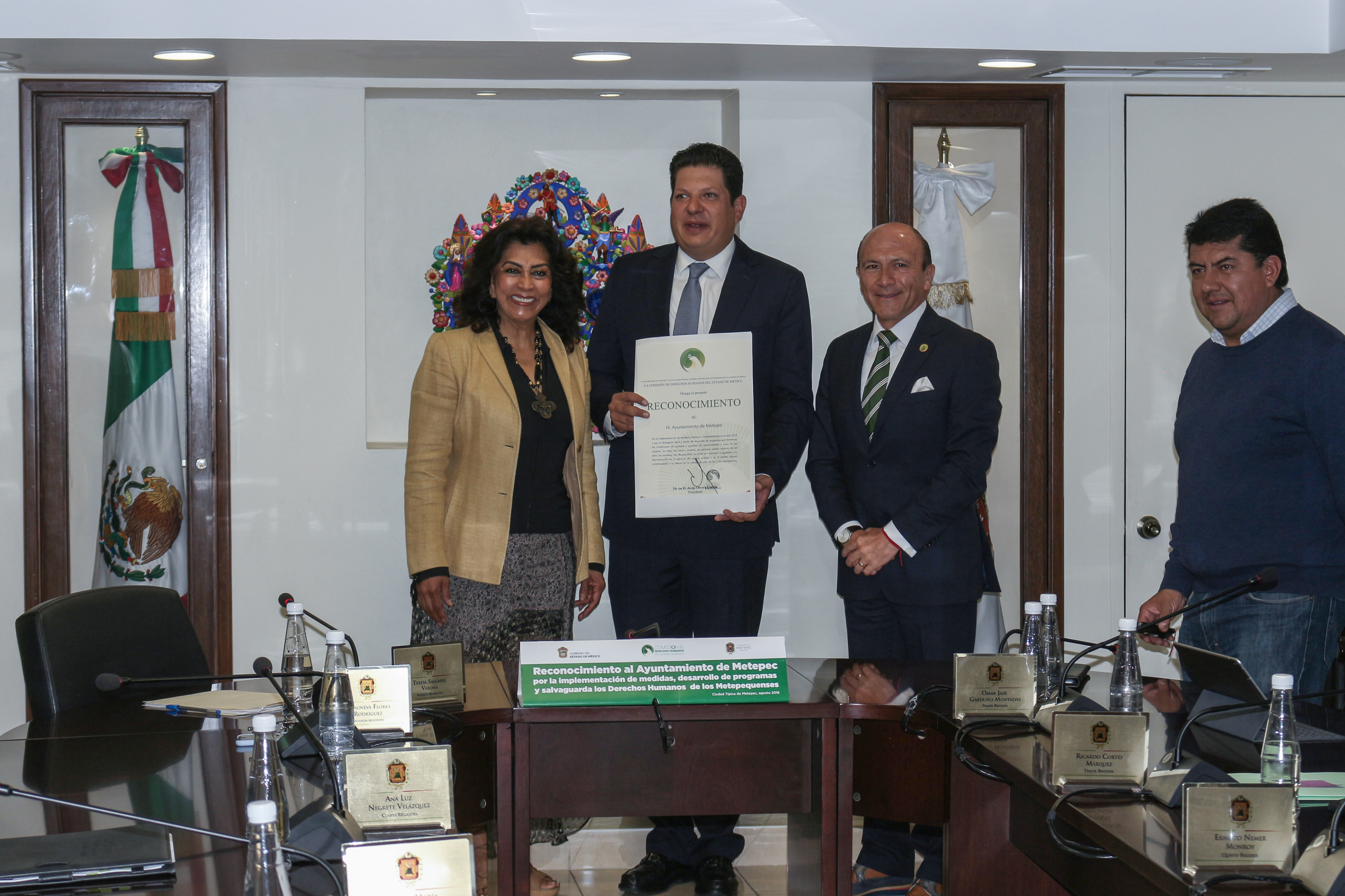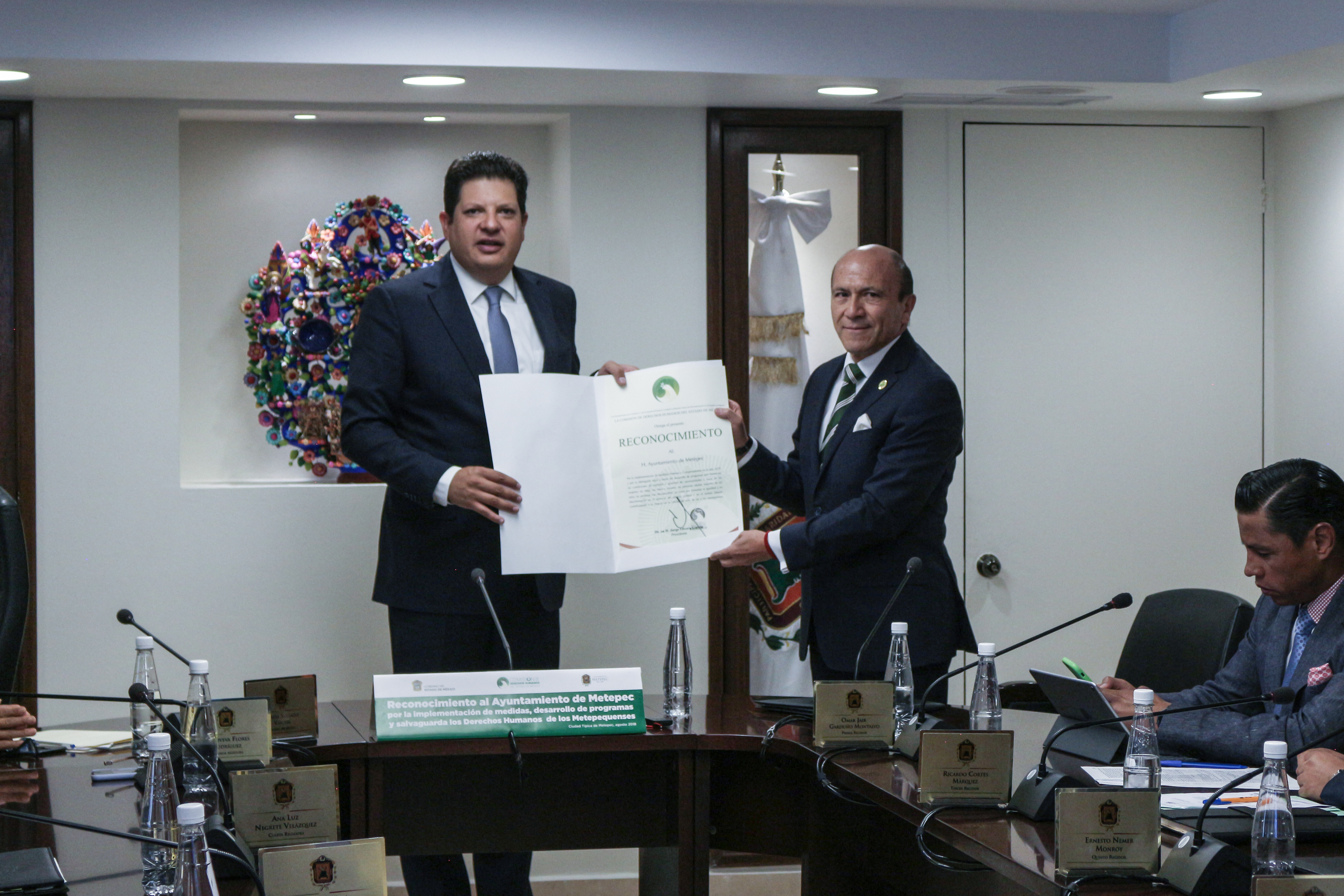 El Primer Visitador General de la Comisión de Derechos Humanos del Estado de México (Codhem), José Benjamín Bernal Suárez, en representación del ombudsperson mexiquense Jorge Olvera García, entregó al presidente municipal David López Cárdenas, un reconocimiento al ayuntamiento de Metepec por la implementación de Medidas Positivas y Compensatorias en 2018, que favorecen a los grupos en situación de vulnerabilidad, y exhortó a mantener la ruta del trato digno hacia las personas.