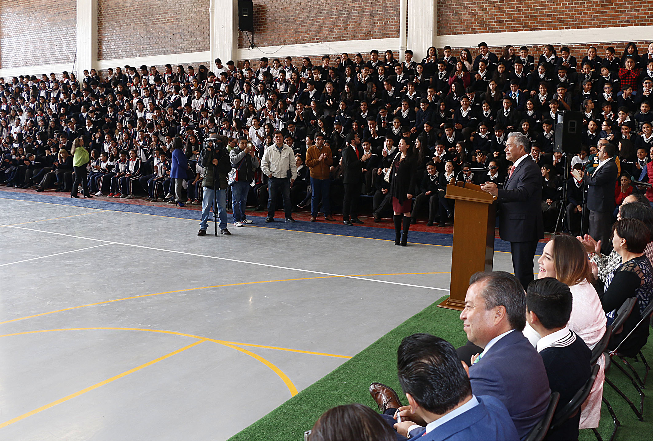Lo anterior durante la ceremonia de Honores a la Bandera, donde el presidente municipal de Toluca, Fernando Zamora Morales, explicó a estudiantes, profesores y padres de familia que los trabajos realizados en el gimnasio, auditorio, canchas deportivas, fachadas exterior y perimetral, son resultado de la gestión del diputado federal César Camacho Quiroz; mejoras que fueron ejecutadas por la administración local a través de la Dirección de Obra Pública.