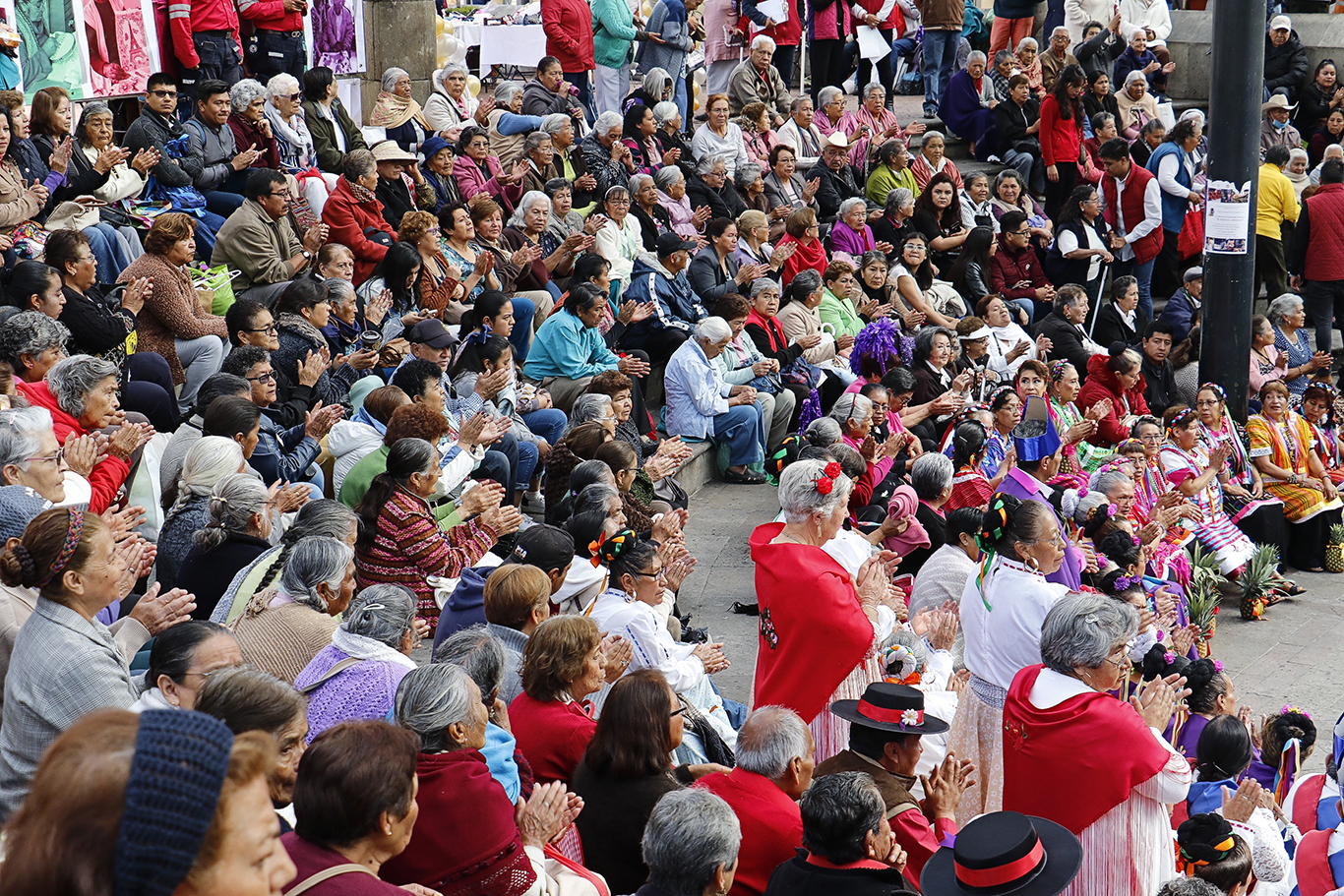 La celebración continuó en un ambiente de alegría en el que con bellos vestidos bordados y flores en la cabeza, mujeres de la Casa Club de El Seminario deleitaron a los asistentes con una Danza Monarca; asimismo, con su cabello trenzado seis abuelitas de San Andrés Cuexcontitlán demostraron sus habilidades y con un elegante arco de flores arrancaron sonrisas al público, mientras que los abuelitos de San Pedro Totoltepec bailaron la Danza de la Piña y los de El Cerrillo Vista Hermosa realizaron una tabla rítmica, en la que participó la presidenta Yolanda Rosales.