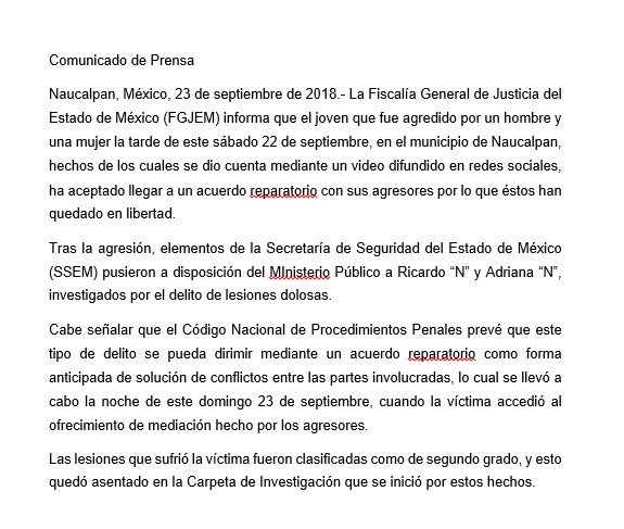 La Fiscalía General de Justicia del Estado de México (FGJEM) informó a través de un comunicado que el joven agredido este sábado aceptó llegar a un acuerdo reparatorio por lo que sus agresores quedaron en libertad.