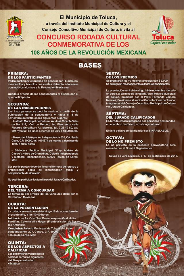Las inscripciones estarán abiertas hasta el 8 de noviembre, por lo que las y los toluqueños podrán dejar volar su imaginación y mostrar su creatividad al adornar sus bicicletas, monociclos y triciclos con motivos alusivos a la Revolución Mexicana, y así participar en la rodada que iniciará a las 10:00 horas en Paseo Cristóbal Colón esquina Gral. Julio Pardiñas, Colonia Villa Hogar y concluirá en el Palacio Municipal de Toluca.