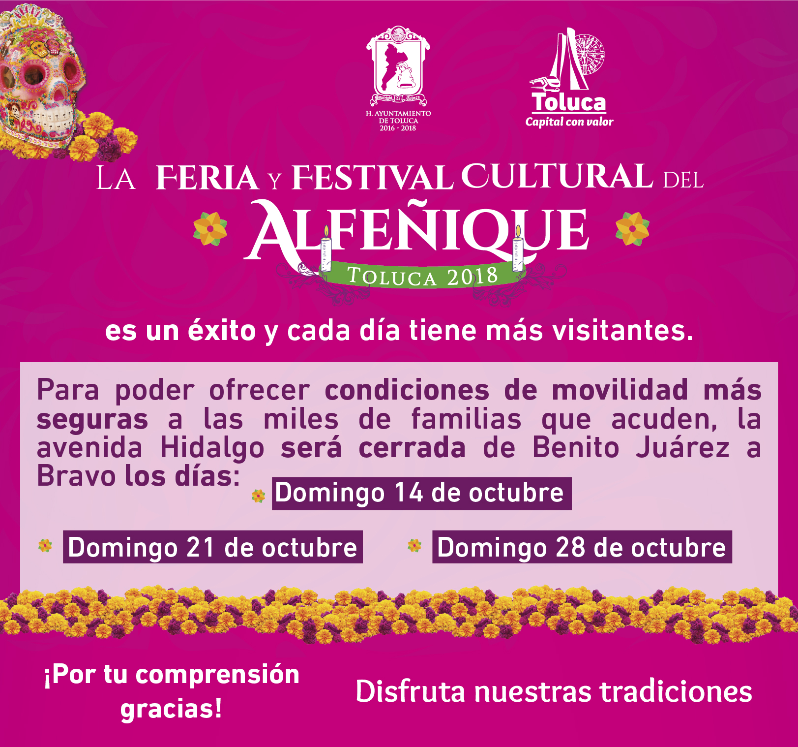 Debido a la gran afluencia que registra la Feria y Festival Cultural del Alfeñique Toluca 2018, los domingos 14, 21 y 28 de octubre la avenida Miguel Hidalgo y Costilla, en el tramo de avenida Benito Juárez a la calle Nicolás Bravo, estará cerrada a la circulación vehicular.
