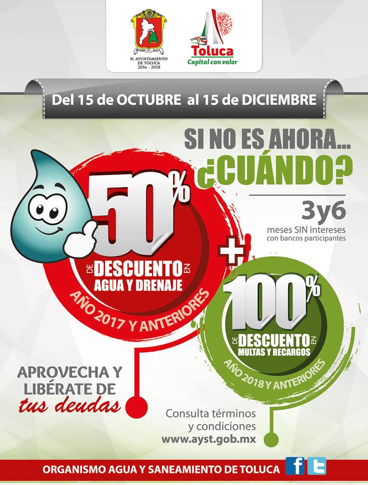Con el objetivo de apoyar el bolsillo de las familias toluqueñas, además de incentivar a los contribuyentes a cumplir con el pago de los servicios de agua potable, drenaje y alcantarillado, el Organismo Agua y Saneamiento de Toluca (OAyST) invita a la población aprovechar la bonificación del 50 por ciento en el pago de los derechos de los ejercicios fiscales 2017 y anteriores, vigente del 15 de octubre al 15 de diciembre de 2018.