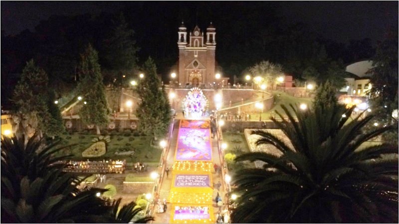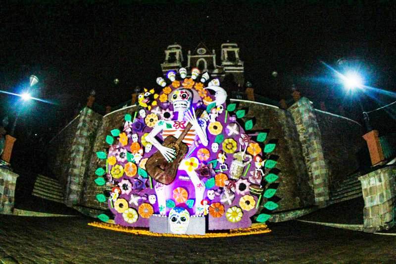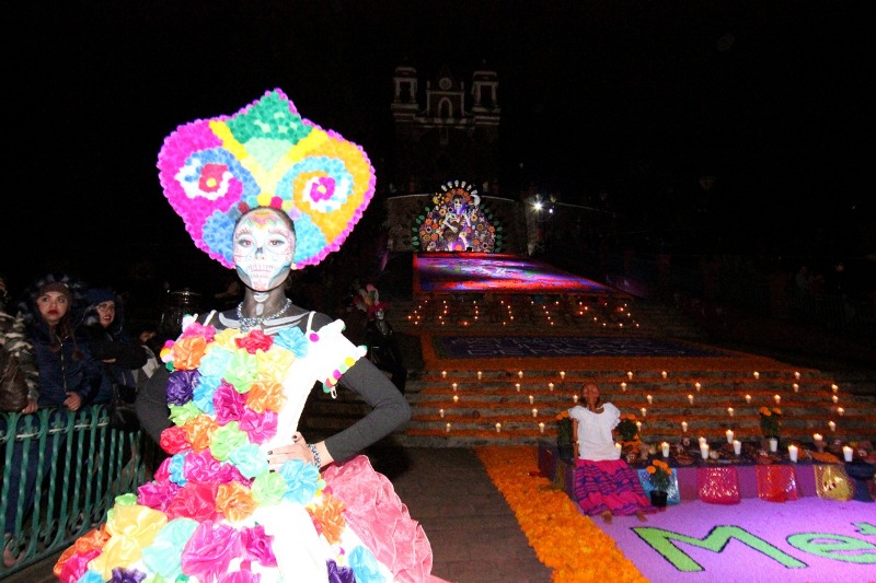 Con una ceremonia y ritual náhuatl, inició la fiesta dedicada a los difuntos teniendo como marco principal, la mega ofrenda compuesta de tres elementos; el primero consta del ofrecimiento de alimentos con decoración típica, instalado en los costados del cuerpo principal en tres niveles con una extensión de 120 metros lineales; el segundo elemento elaborado por maestros de Huamantla, Tlaxcala, es un tapete monumental (centro de las Escalinatas/cuerpo principal) de 30 metros de largo por 8 metros de ancho compuesto por piedrilla de arcilla y mármol teñido, así como flores y piezas de barro y madera.