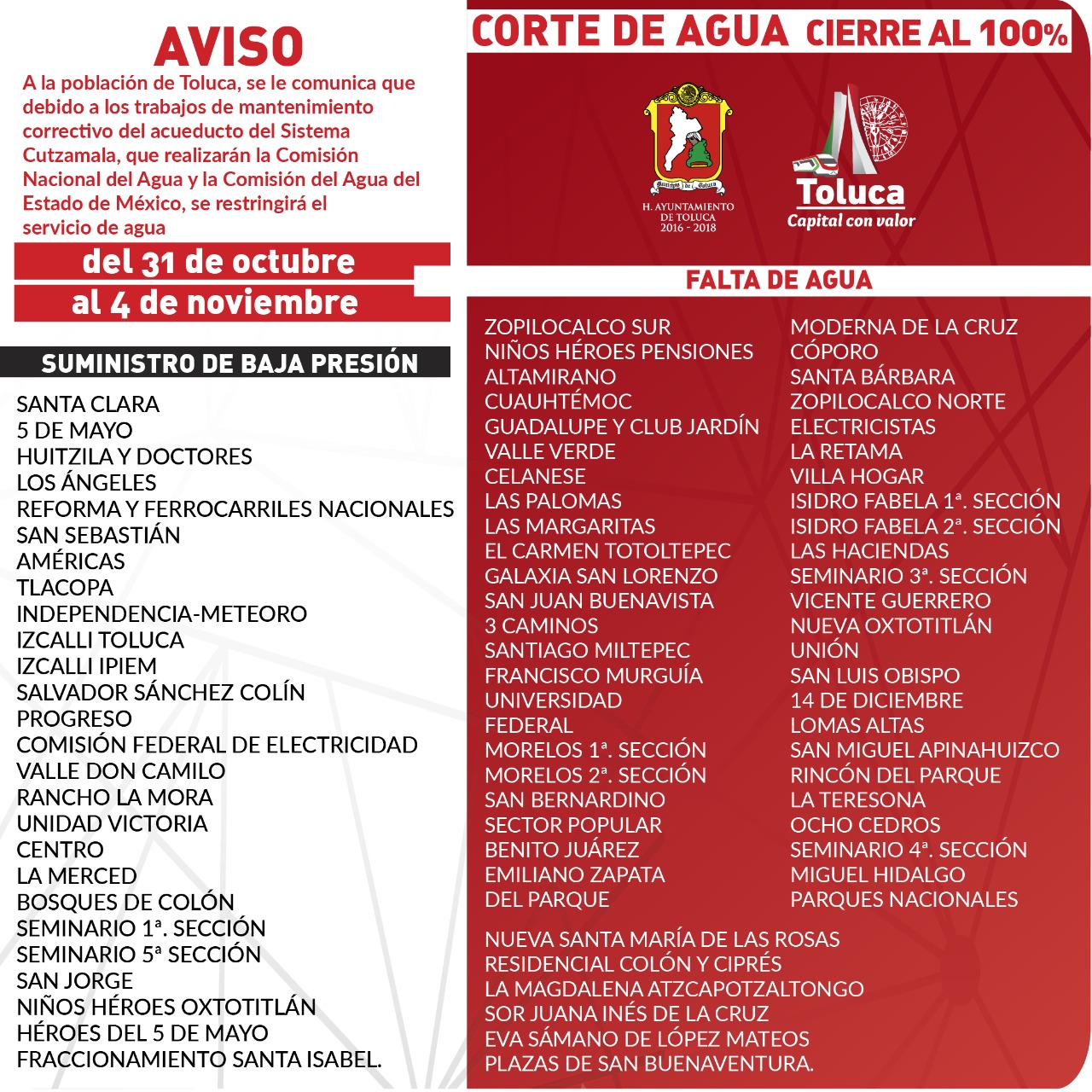 Zopilocalco Sur, Niños Héroes Pensiones, Altamirano, Las Palomas, Celanese, Valle Verde, Nueva Santa María de las Rosas, San Bernardino, Universidad, Francisco Murguía, El Cóporo, Santa Bárbara, Zopilocalco Norte, Electricistas, La Retama, Villa Hogar, Isidro Fabela 1ª y 2ª Sección, Las Haciendas, Seminario 3ª y 4ª Sección, Vicente Guerrero, Plazas de San Buenaventura, Nueva Oxtotitlán, San Luis Obispo, 14 de Diciembre, Lomas Altas, San Miguel Apinahuizco, Rincón del Parque, La Teresona, Ocho Cedros, Miguel Hidalgo, Parques Nacionales, Residencial Colón y Ciprés, Federal, Morelos 1ª y 2ª Sección, Las Margaritas, La Magdalena Atzcapotzaltongo, El Carmen Totoltepec, Galaxia San Lorenzo, San Juan Buenavista, 3 Caminos, Santiago Miltepec, Cuauhtémoc, Guadalupe y Club Jardín, Unión, Sor Juana Inés de la Cruz, Sector Popular, Benito Juárez, Eva Sámano de López Mateos, Emiliano Zapata, Del Parque y Moderna de la Cruz, son las colonias donde el corte de agua será al cien por ciento.